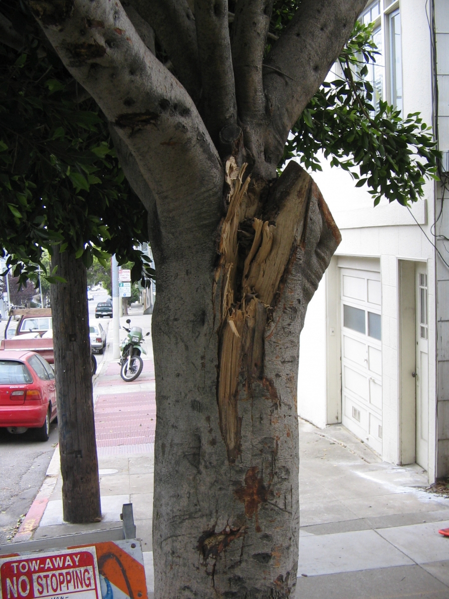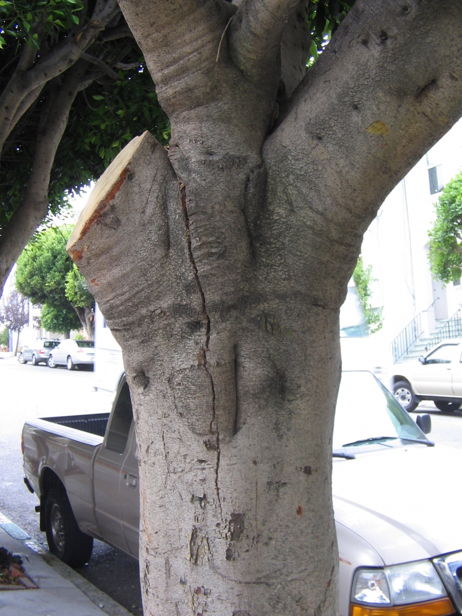 | Ficus with split trunk caused by a limb that fell due to competing branch structure (front and back view). |