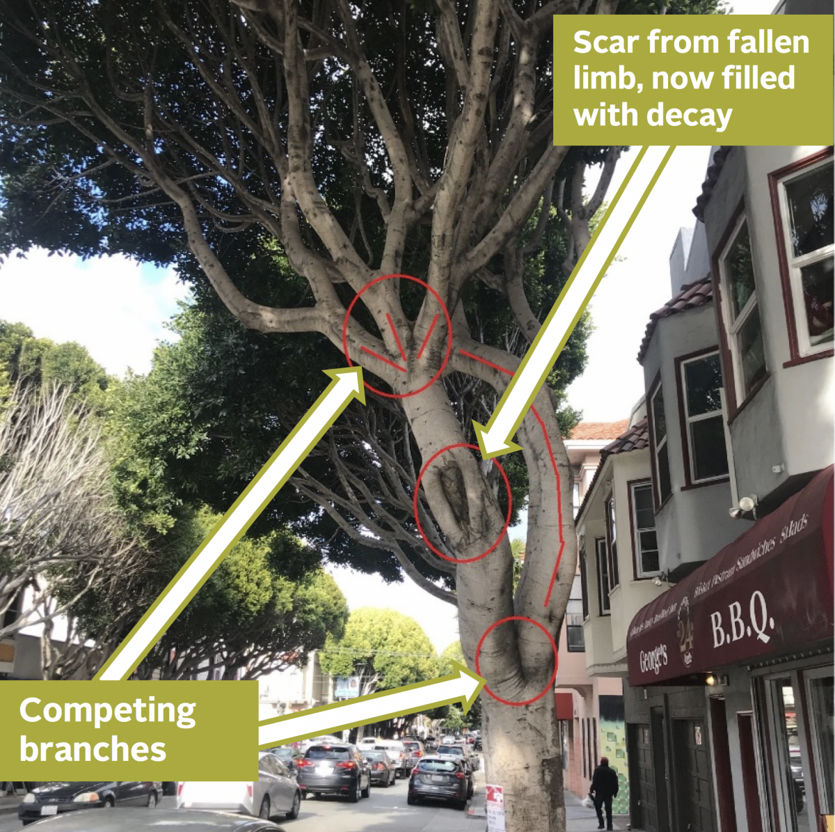Ficus with split trunk caused by a limb that fell due to competing branch structure (front and back view). |
