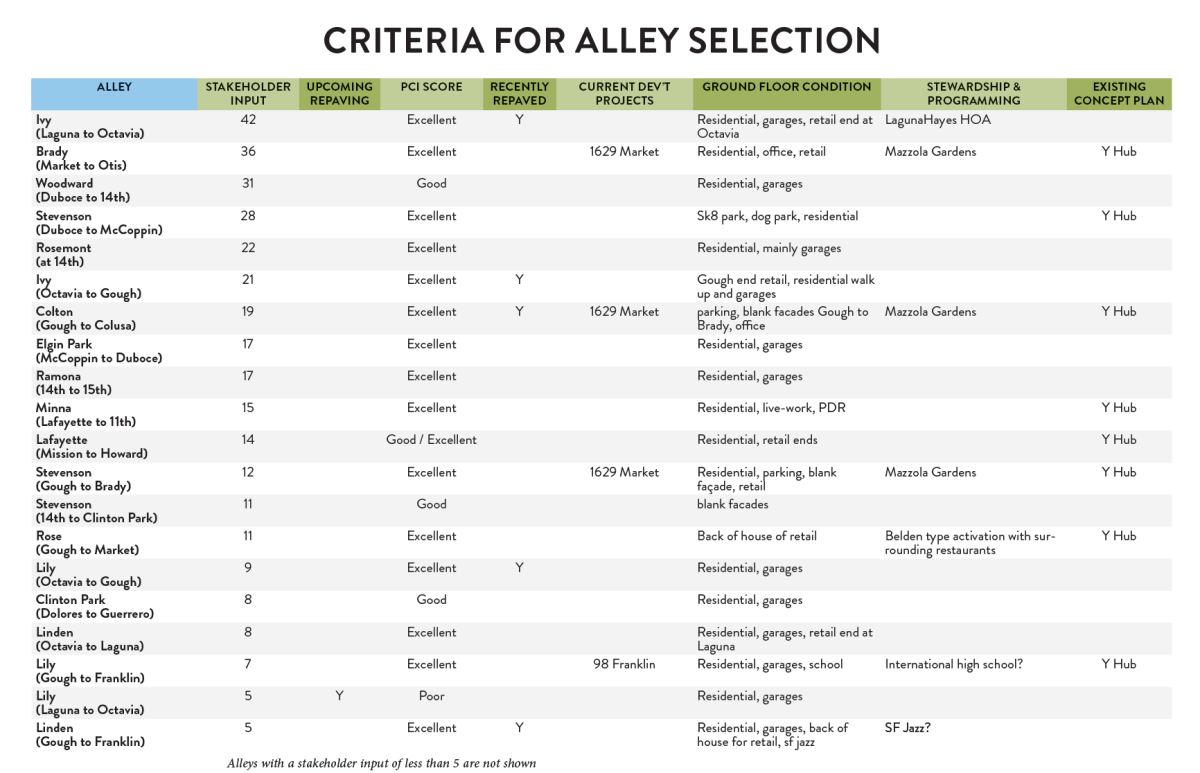 The Market Octavia Plan (2008) identified alley improvements as a means of creating shared multipurpose public spaces - traffic calmed environments contrast the heavy traffic on the surrounding arterial streets.